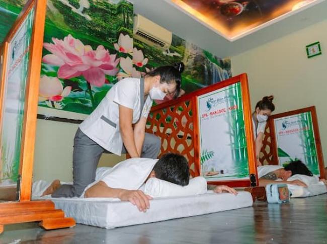 - MASSAGE CỔ VAI GÁY: Dựa trên các động tác xoa bóp ấn huyệt giữa bã vai làm xoa diệu các mô cơ xung quanh cổ vai và gáy để giảm đau giảm căng thẳng trong vùng này.